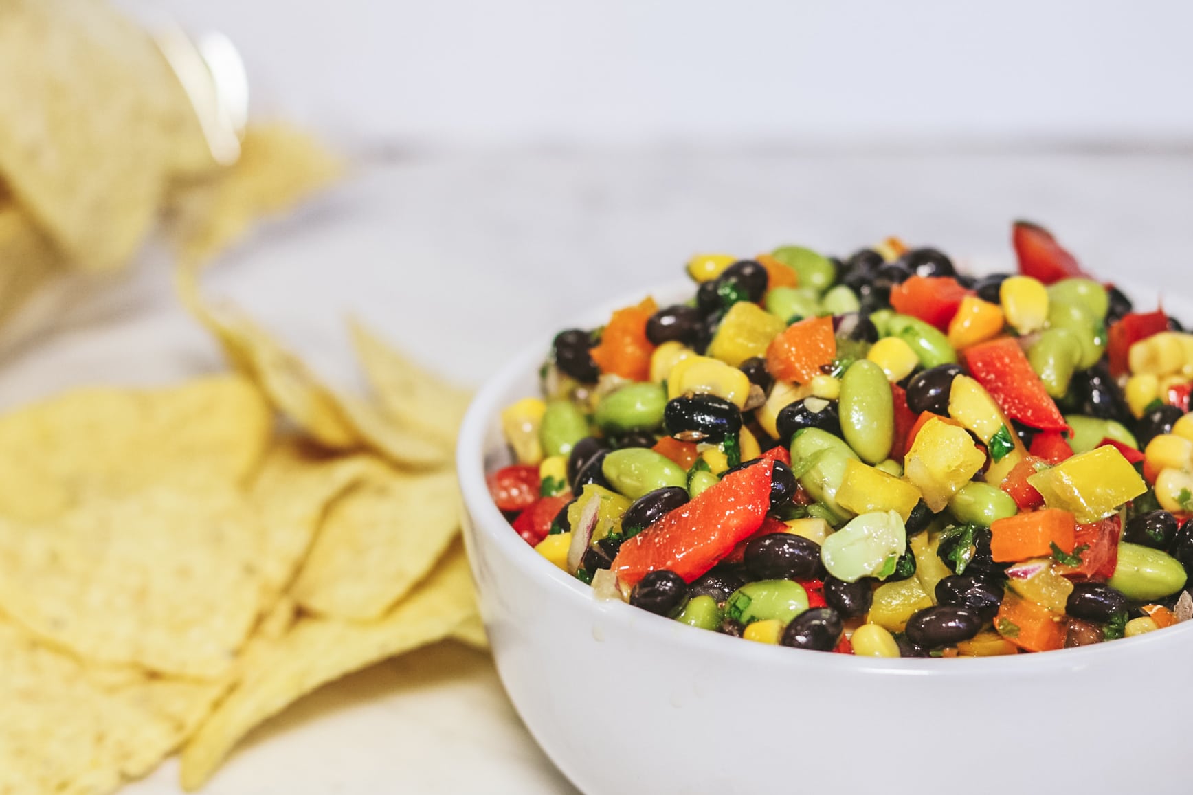 edamame, corn, black beans, assorted sweet peppers, red onion, cilantro, lime juice, canola oil, salt, sugar, cumin.